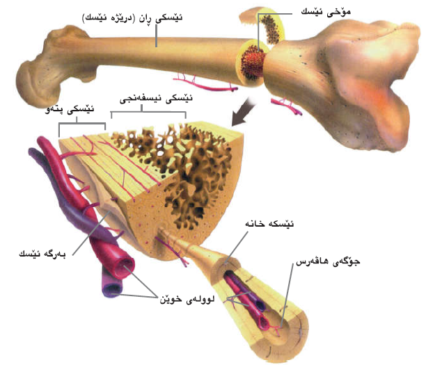 لە ژێر ئێسكی پتەودا تۆڕێك لە بەستەرە شانە هەیە، كە ناودەبرێت بە ئێسكی ئیسفەنجی. ئێسكی ئیسفەنجیش، لە كەلێنی فراوان پێكدێت كە ژمارەیەك ئێسكە پەڕەی تێدایە بە تەریبی ڕیزكراون لەگەڵ هێڵی هێزی پەستاندا، كە وای لێ دەكات بەرگەی پەستانی گەورە بگرێت و لەكێشی ئێسكەكەش كەم بكاتەوە.